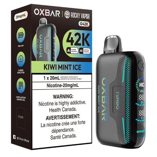 Flavour Notes: Kiwi Mint Ice Specifications: Up to 42,000 Puffs Airflow Control LED Display Screen 5 firing modes 900mAh Battery Dual Mes...